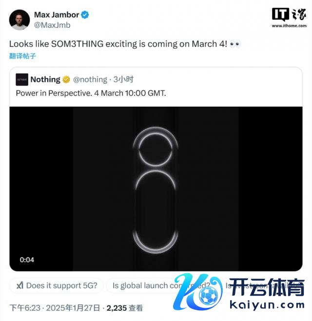 固然 Nothing 莫得平率直出新诞生的称呼,但爆料东谈主士 Max Jambor 长远,新品可能是 Nothing Phone 3。在另一条推文中,Jambor 还发布了一份看似官方的邀请函,提到 3 月 4 日在西班牙巴塞罗那举行的作为。这标明 Nothing 很可能会在巴塞罗那举行的宇宙迁移通讯大会(MWC)技巧发布生人机,该大会将于当地时候 3 月 3 日开幕。