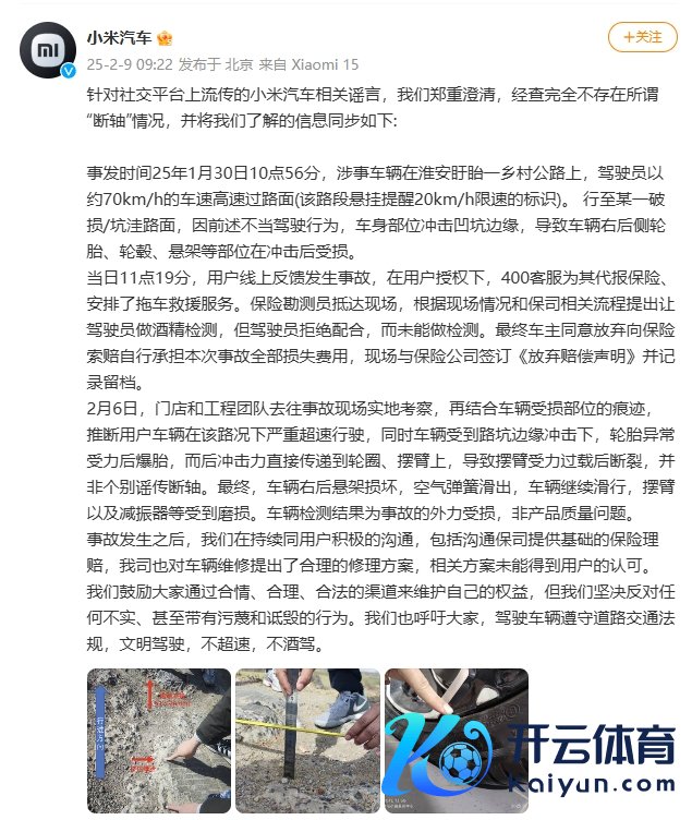 2月9日,小米汽车发布声昭示意,针对外交平台淡雅传的小米汽车干系妄语,小心清醒,经查皆备不存在所谓“断轴”情况欧洲杯体育,并同步干系信息。
