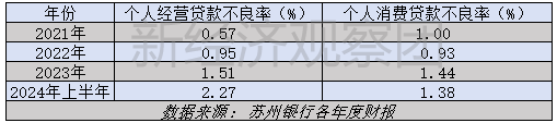 从近几年情况看,苏州银行个东谈主谋划贷款不良率逐年攀升,已由2021年的0.57%升至2024年上半年末的2.27%,进步了1.7个百分点;个东谈主消耗贷款的不良率虽较2023年末着落了0.06个百分点至1.38%,但仍高于2022年之前的水平。